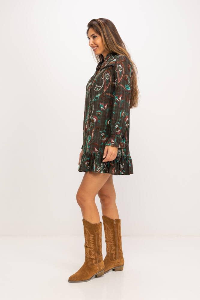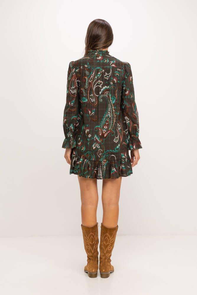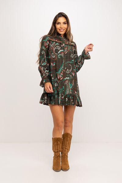 Vestido de algodón dejido con grabado, cuadros y flecos en tonos verdes kaki.