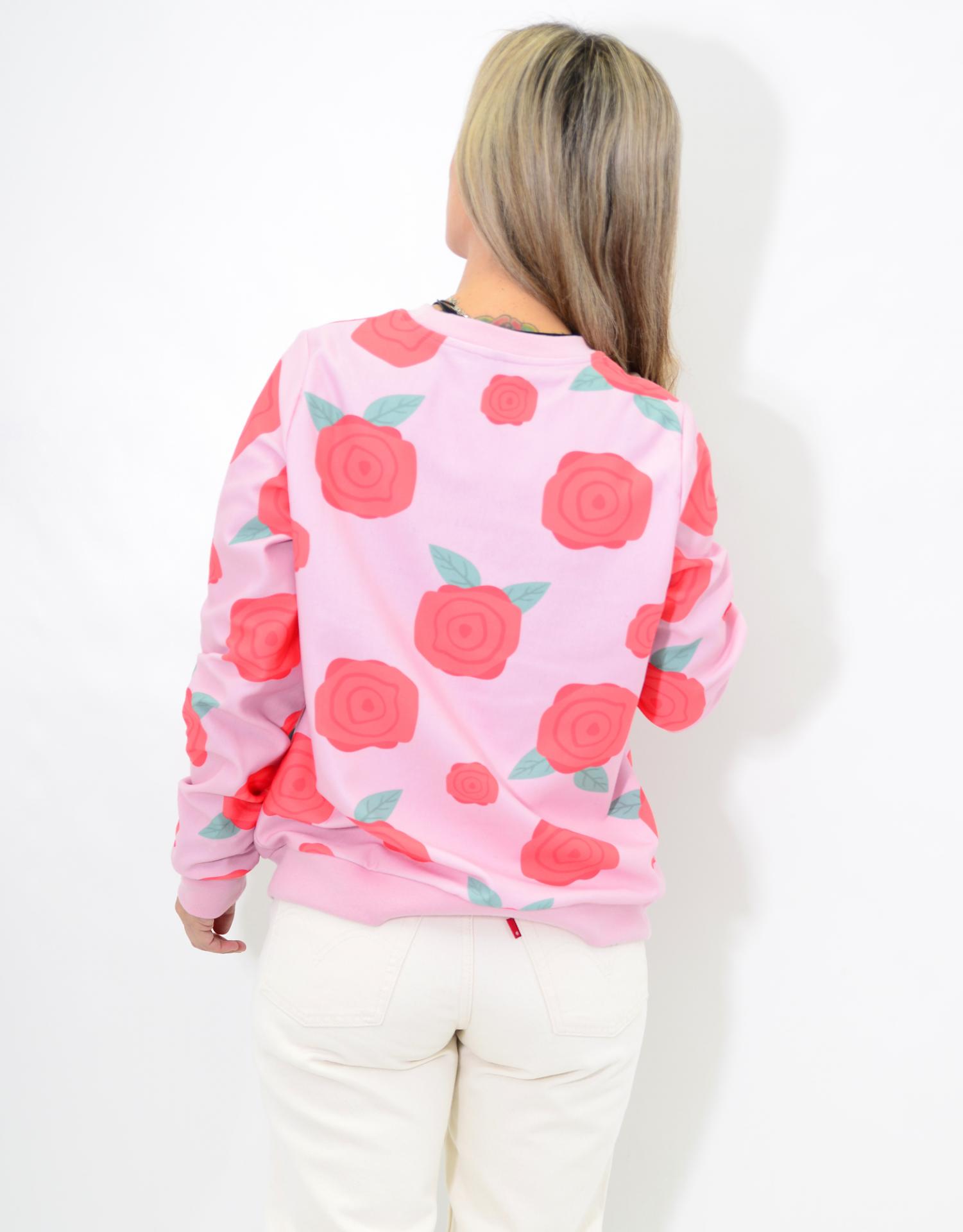 Sudadera de manga larga, con pelito por dentro. Con fondo rosa chicle, y estampado de rosas rojas. Ilustración de «Alma de frida» en el centro. Es maravillosa!