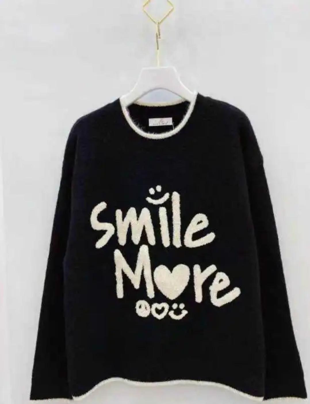 Jersey de manga larga y escote redondo de color negro con ribetes en blanco, con un bonito bordado de caritas de smile en blanco también.