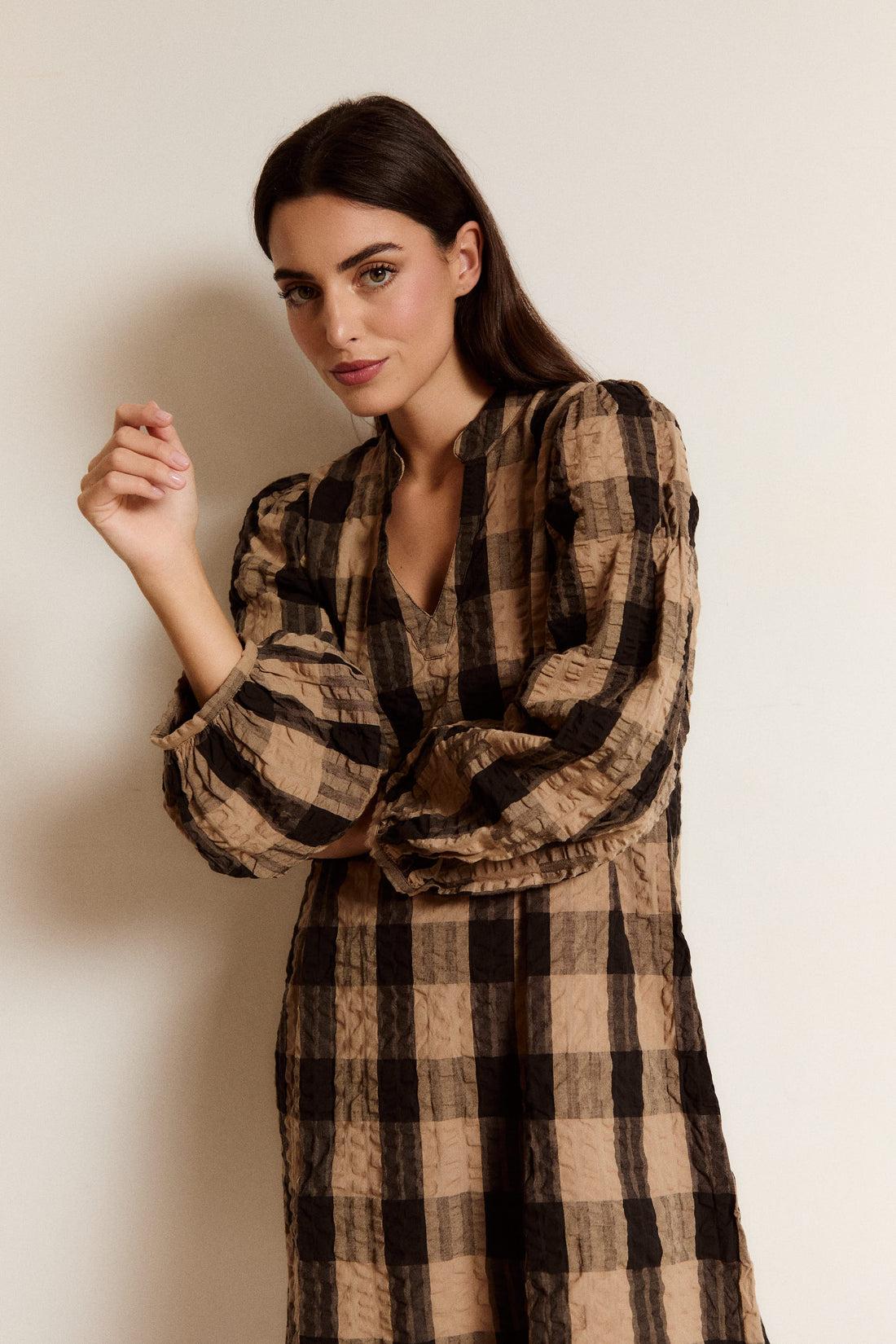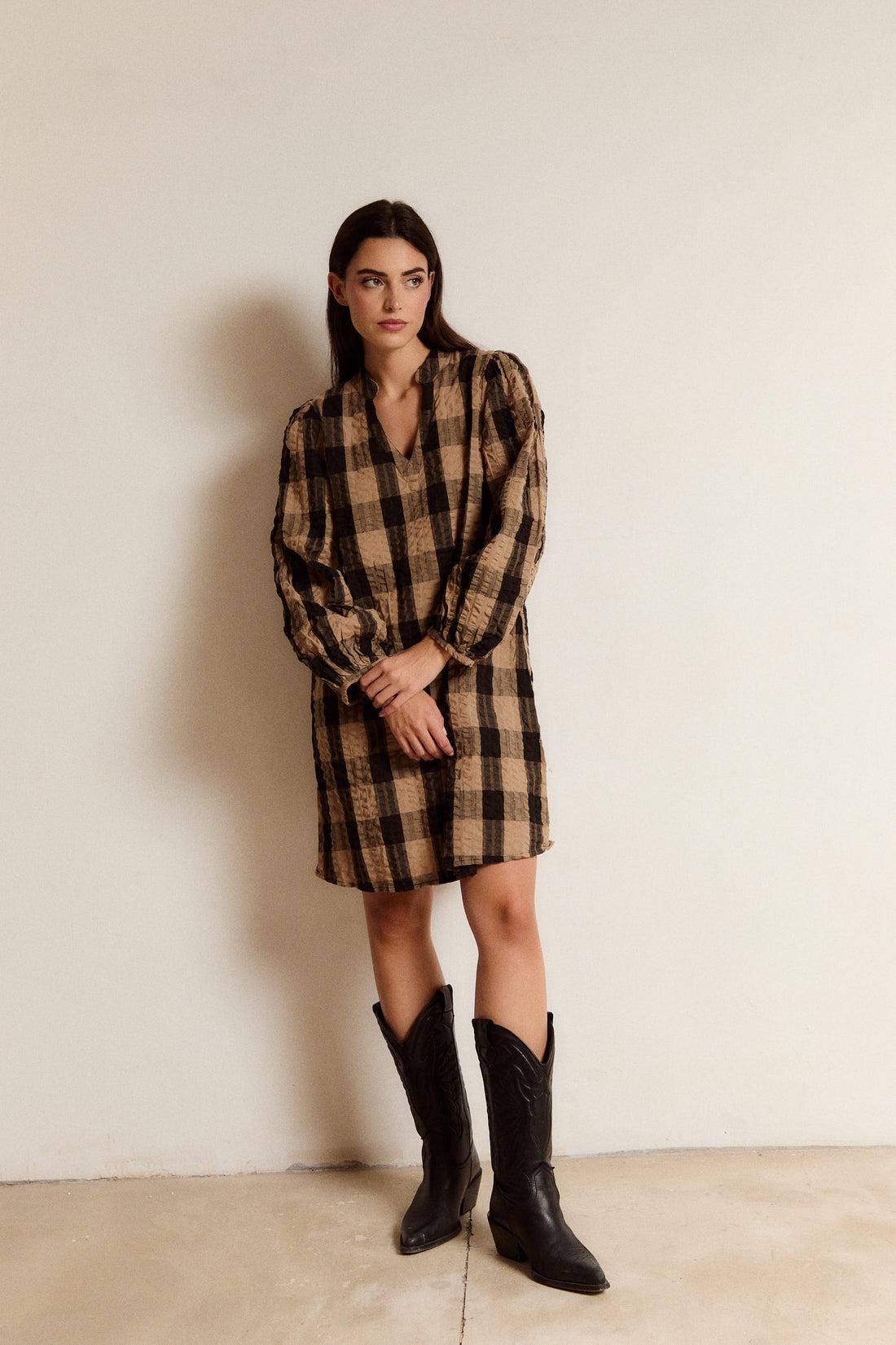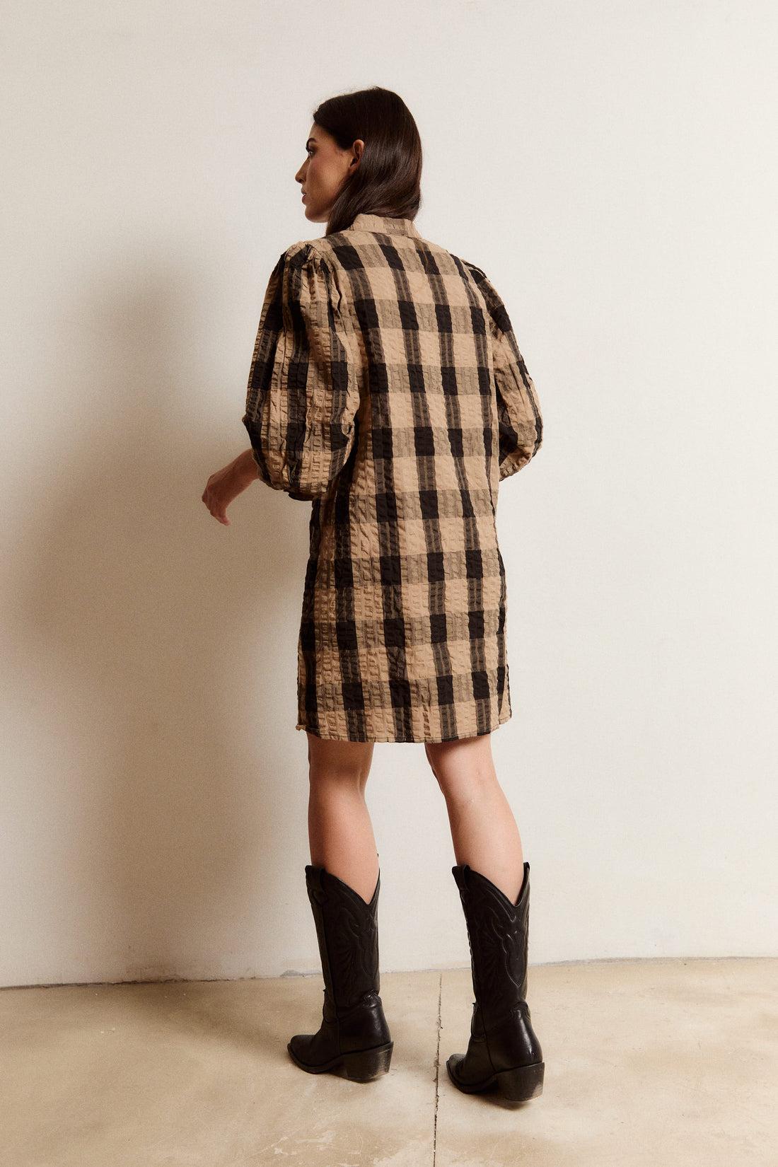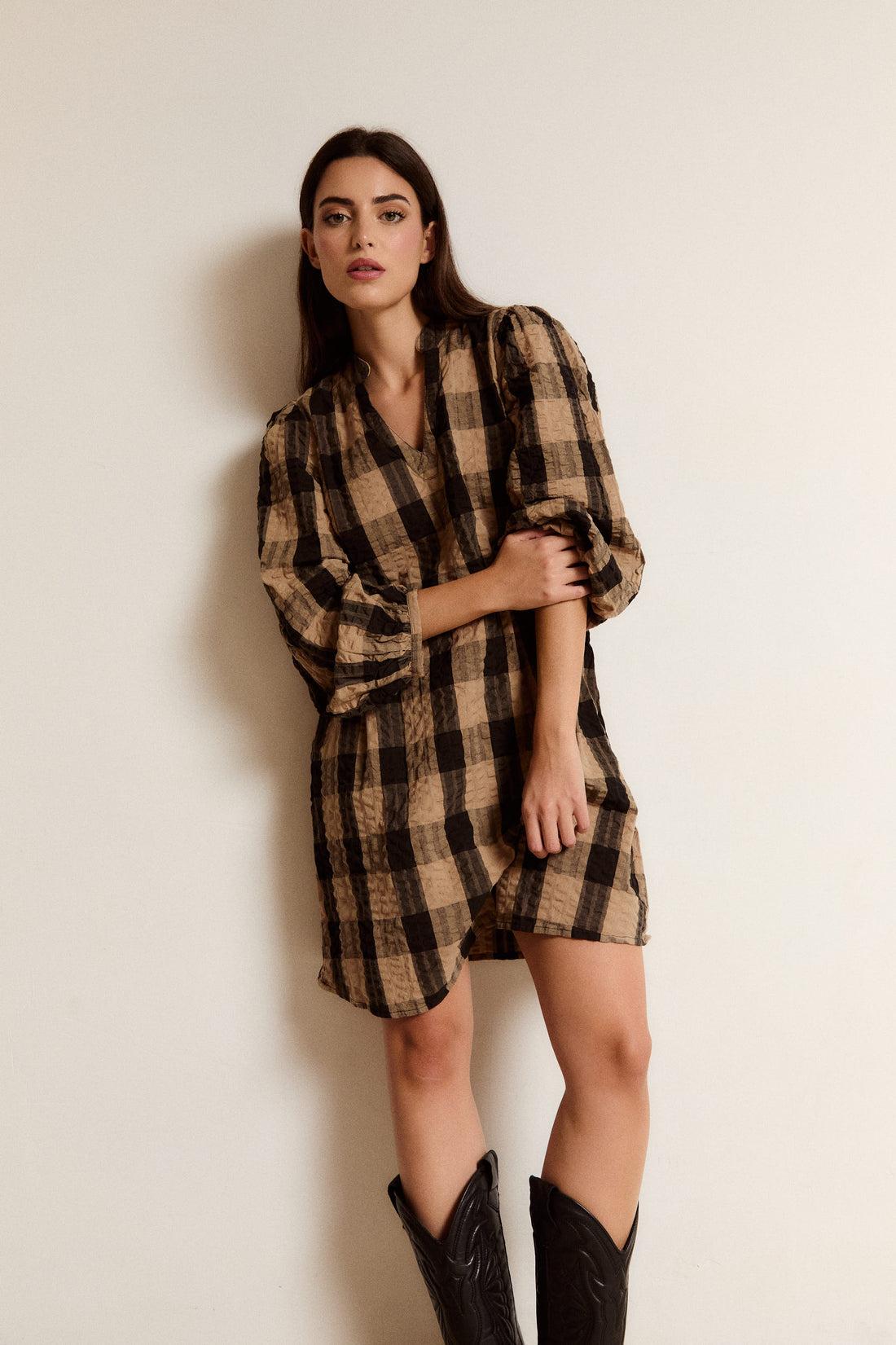Vestido corto y suelto, en tejido con textura, 100% algodón, de cuadros en tonos marrones y negros, y con las mangas con volumen.