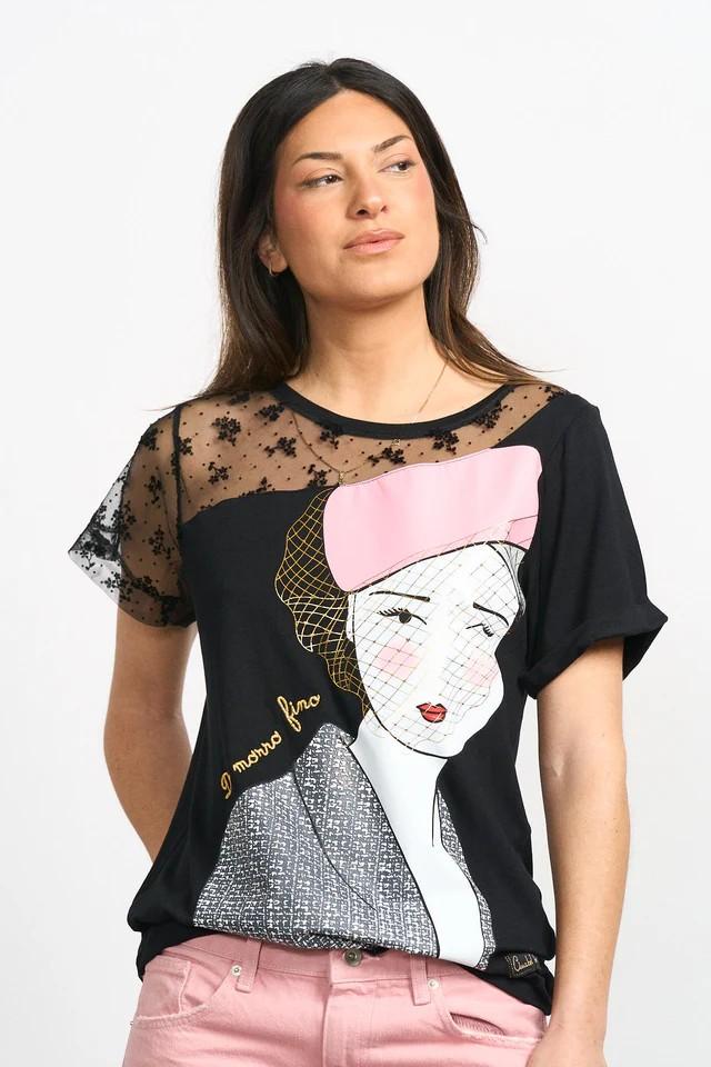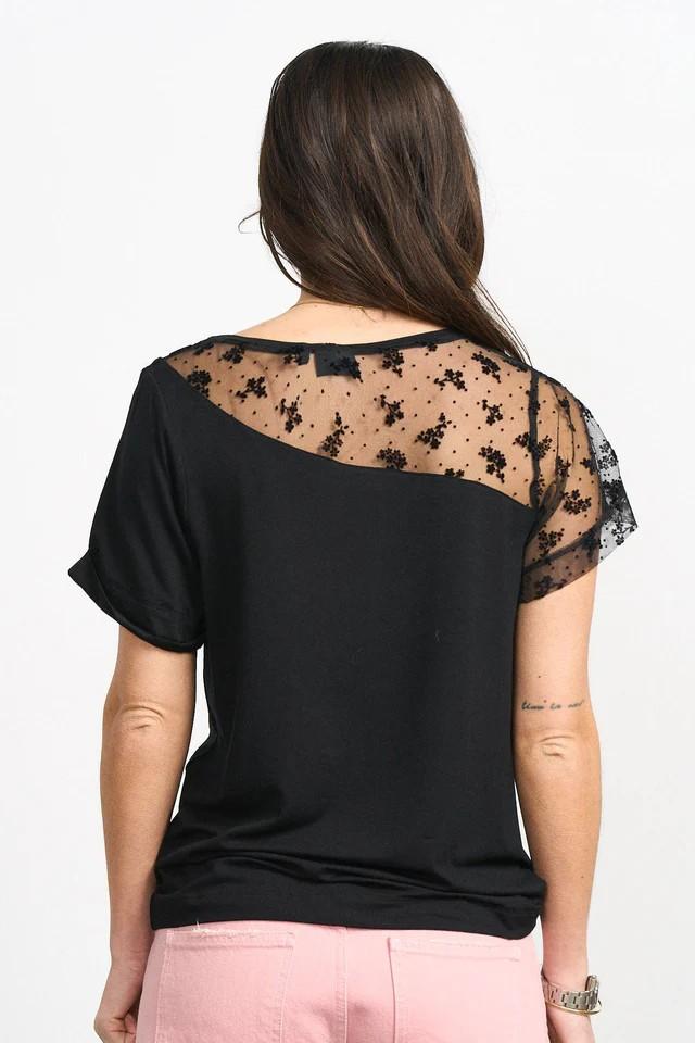 -Detalle de puntilla con relieve de foco, en manga y hombro derecho.
