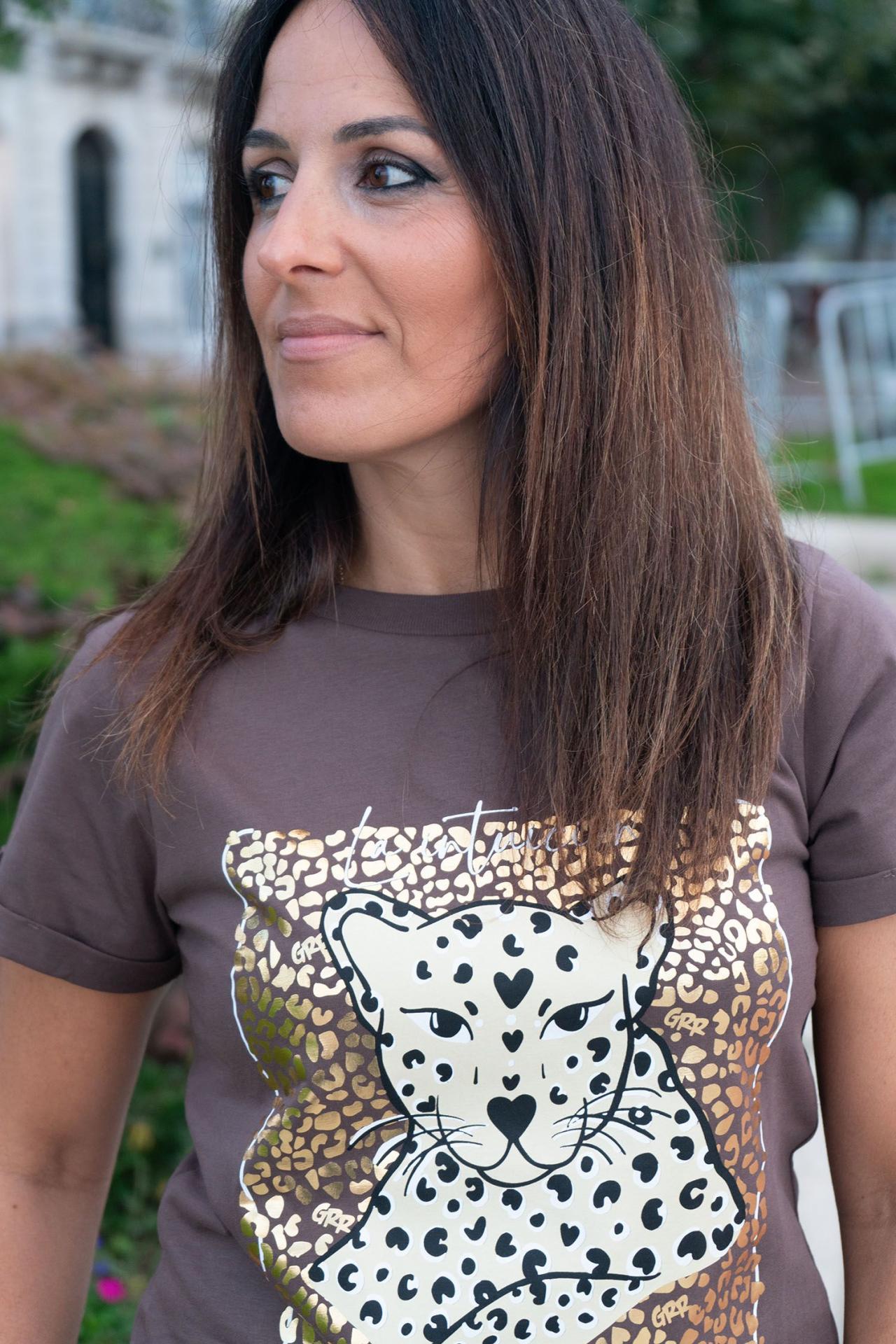 Camiseta marrón de mujer en tejido 100% Algodón. Ilustración “Intuición” en el pecho. Ilustración de leopardo en tonos beige y negro sobre fondo Animal Print en foil dorado con el lema “La intuición es el susurro del alma”. Manga corta con dobladillo, cuello redondo y aberturas laterales.