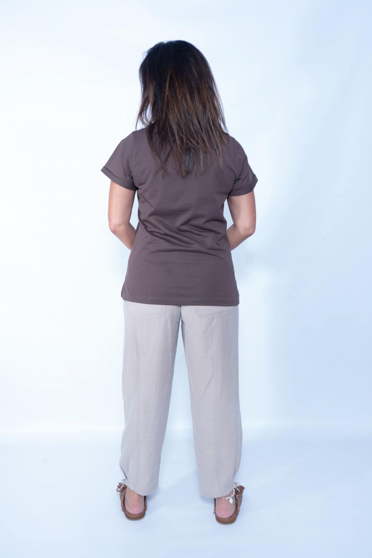– Camiseta marrón de mujer de manga corta 100% algodón.