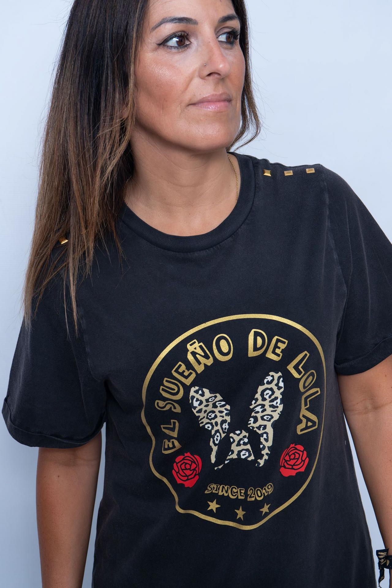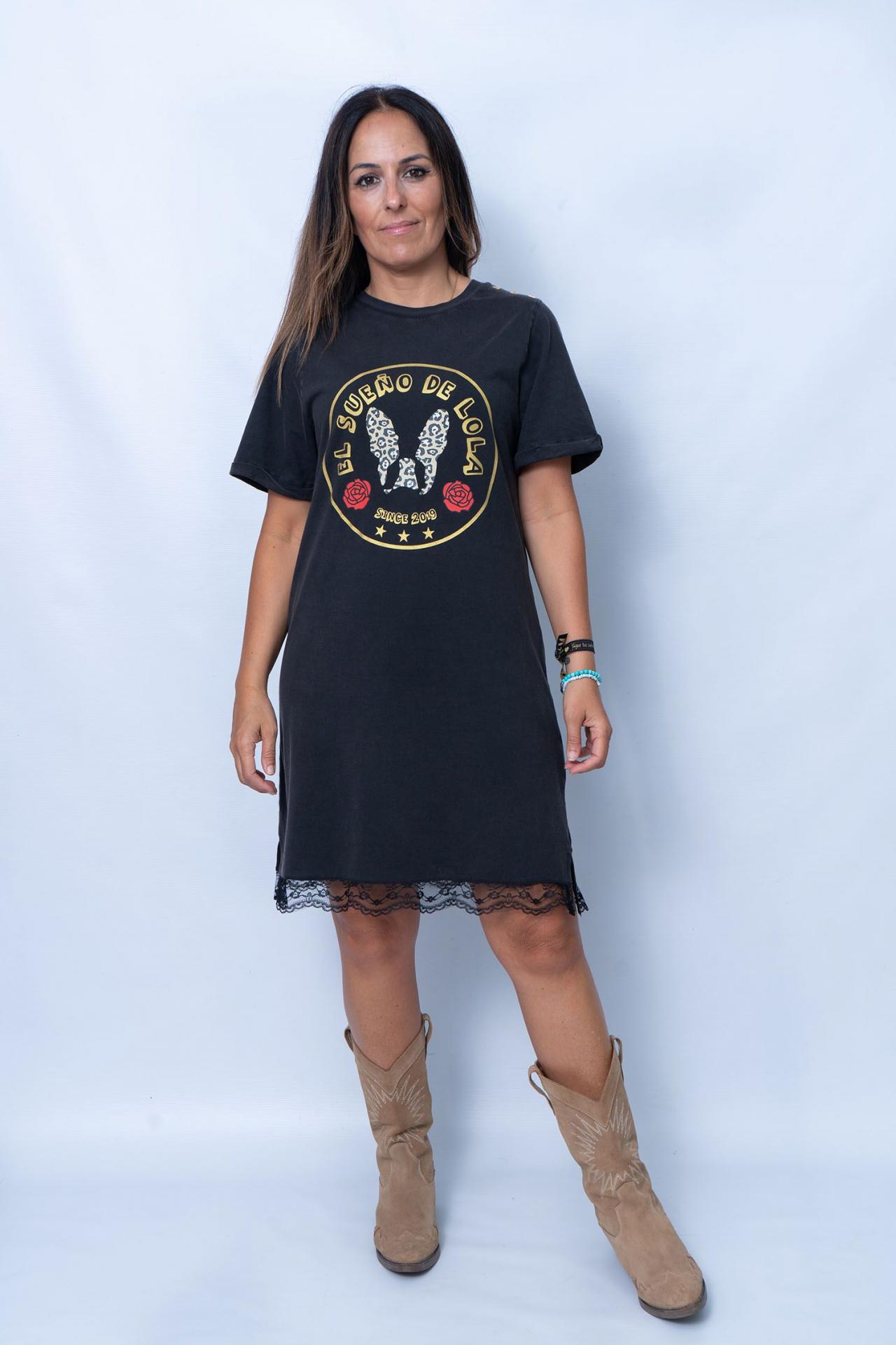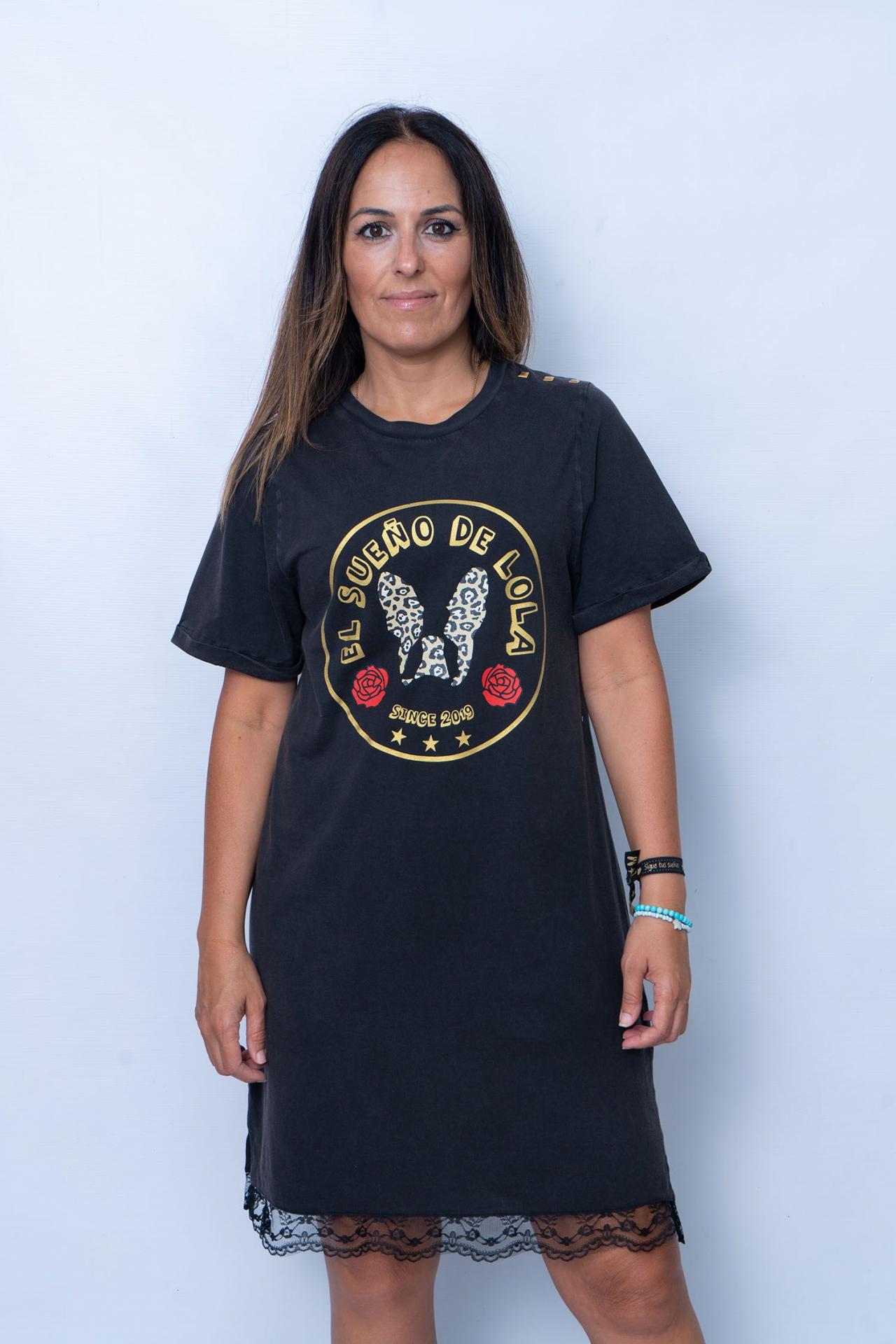 Vestido de mujer en color gris fade out efecto lavado de manga corta. 100% algodón. Maxi print “Rock & Roses” en el pecho. Cuello redondo, aberturas laterales, bajo con encaje y tachuelas cuadradas doradas en los hombros.